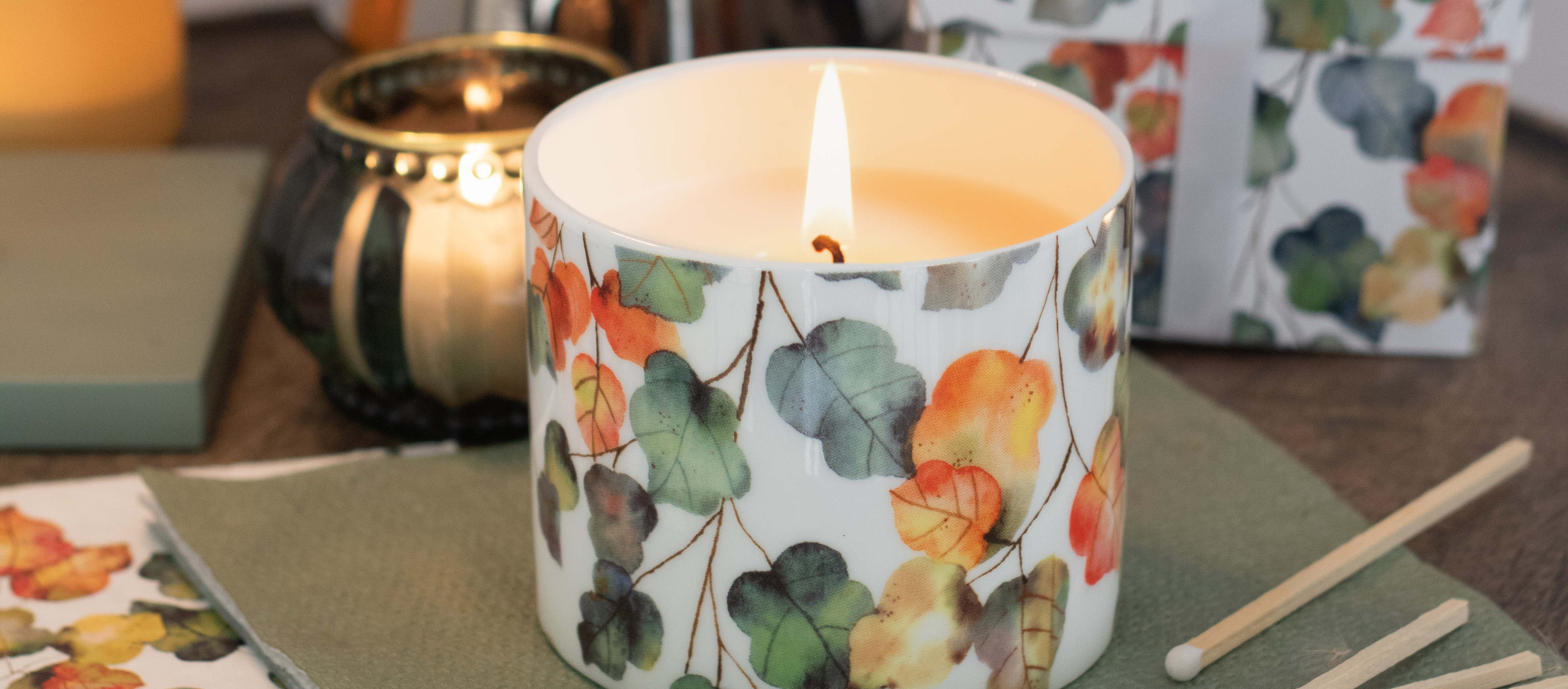 Dekorierte Kerze, 100% Parafin, in hochwertigem Fine-Bone-China-Gefäß in edler Geschenkkartonage